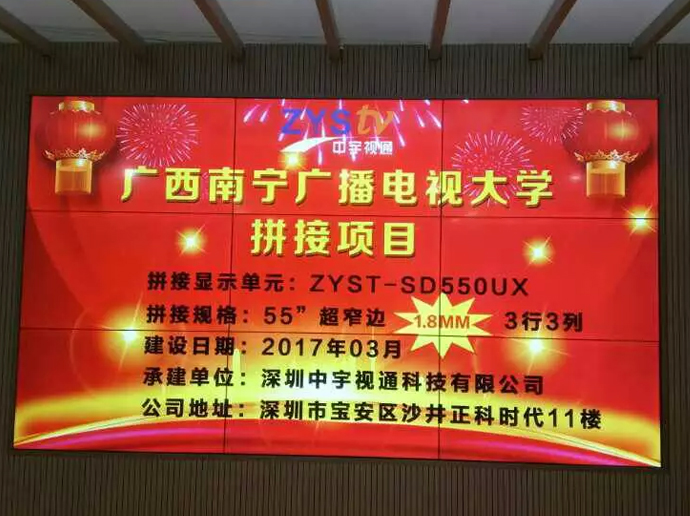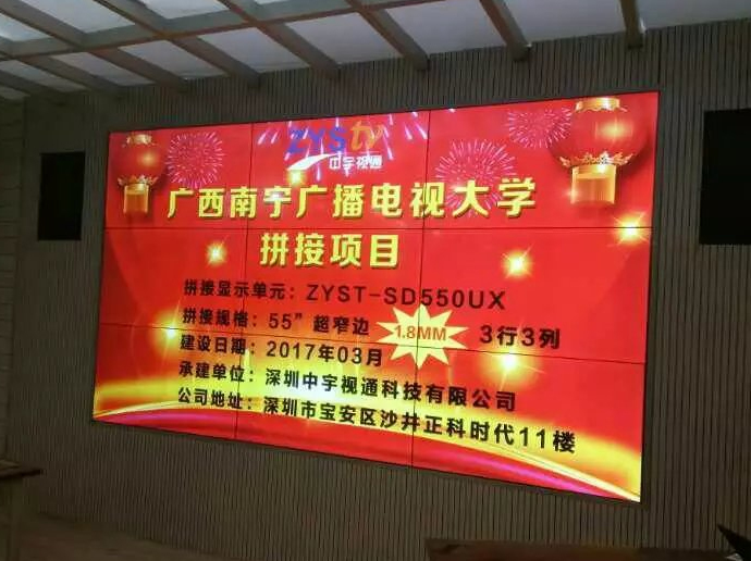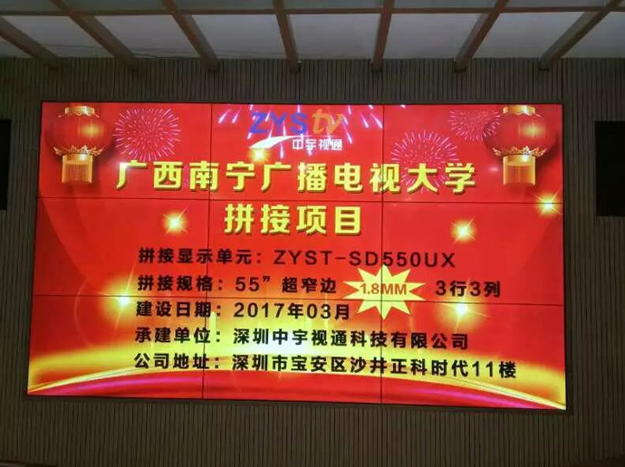 拼接項目:廣西南寧廣播電視大學拼接單元:ZYST-SD550UX拼接拼縫:1.8mm拼接規格:3*3拼接尺寸:55寸拼接屏安裝方式:壁掛承建地址:廣西南寧廣播電視大學承建日期:2017年3月承建單位:深圳中宇視通科技有限公司