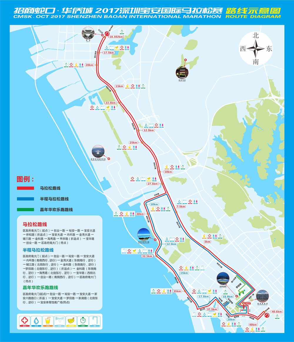 (一)起點:寶安區(qū)政府南大門; 馬拉松、半程馬拉松終點:寶安區(qū)政府南大門; 嘉年華歡樂跑終點:寶安體育館南廣場;