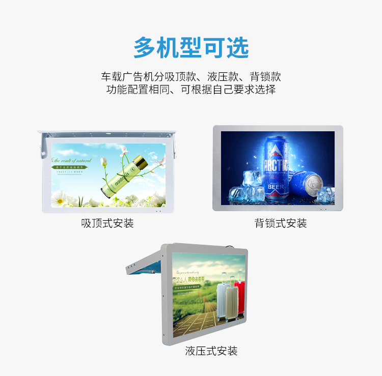 中宇視通是18.5寸車載廣告機生產廠家,我們提供吸頂車載廣告機、背掛車載廣告機、折疊式車載廣告機多種安裝方式,滿足各種車型,內置抗振設計,減少車載環境內震動對機器本身的影響,能讓機器在特殊情況中穩定運行。