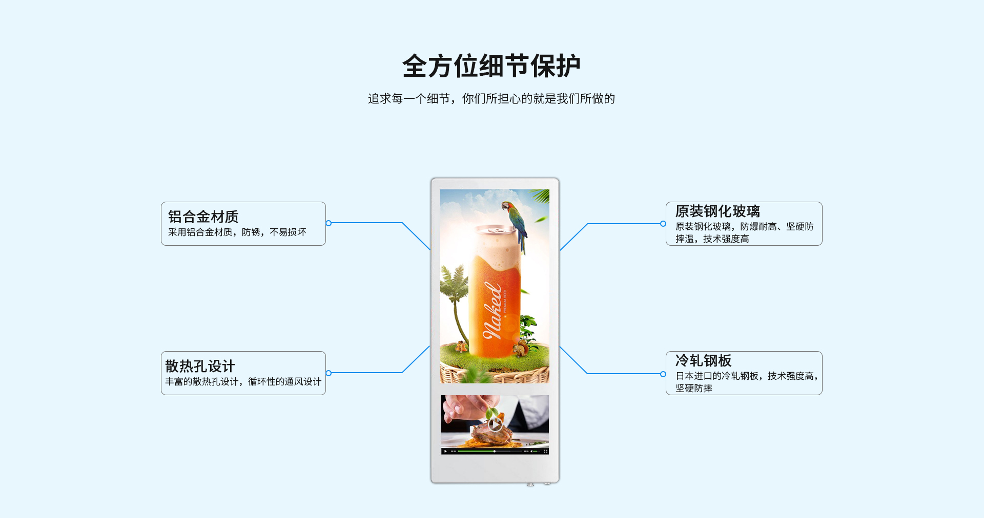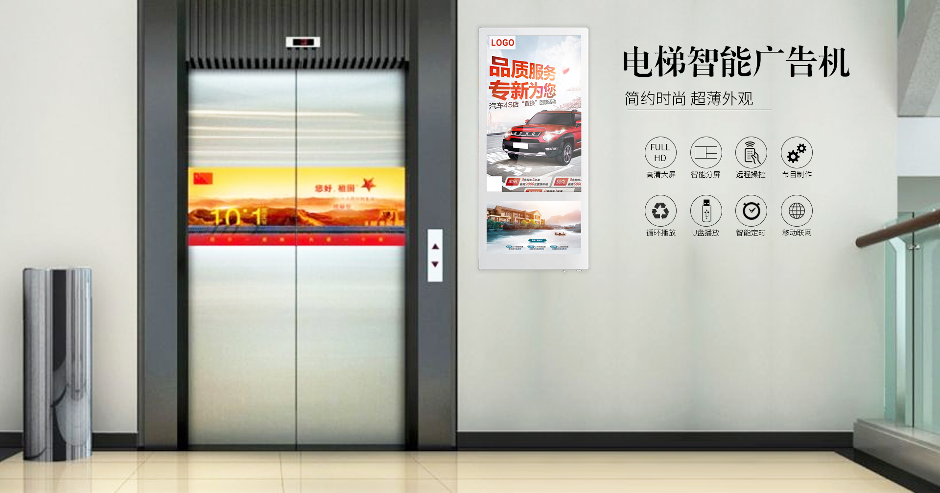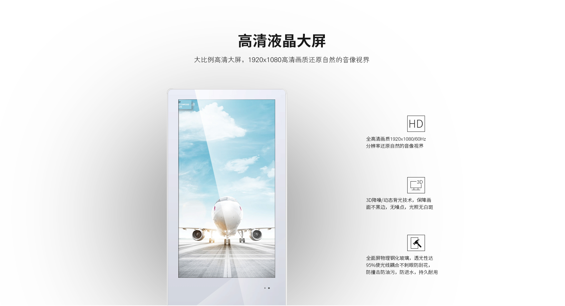 流線設計、匠心工藝:分眾傳媒電梯廣告機采用整體圓弧流線設計,2.5厘米超薄機身,高密度鋁合金包邊平滑不割手,鋼琴烤漆工藝,防刮防銹防變形,好保養、好手感。